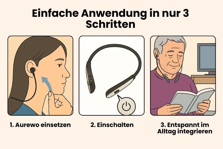 Die Aurewo-Therapie ist unkompliziert und angenehm anzuwenden. In nur 3 Schritten können Sie Ihr Hörvermögen Schritt für Schritt verbessern.